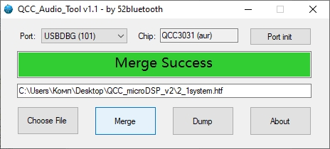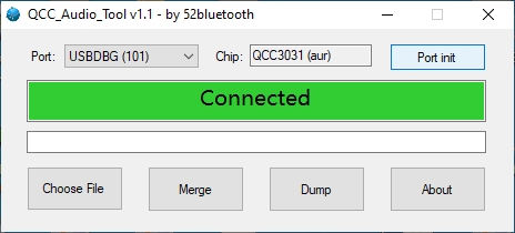 Для того чтобы сохранить настройки в постоянную память, запускаем QCC Audio Tool, выбираем ранее сохраненный файл. Для подключения к чипу жмем Port init