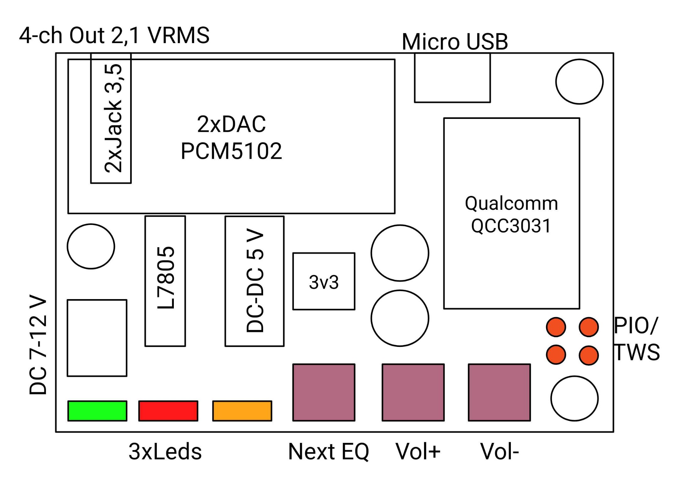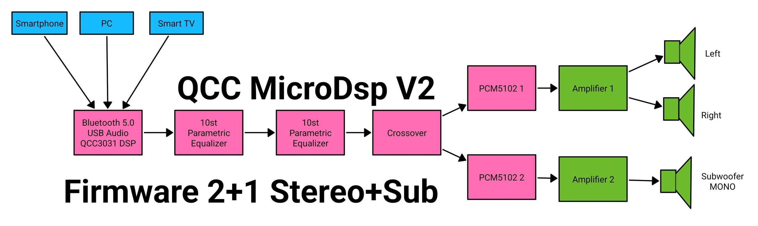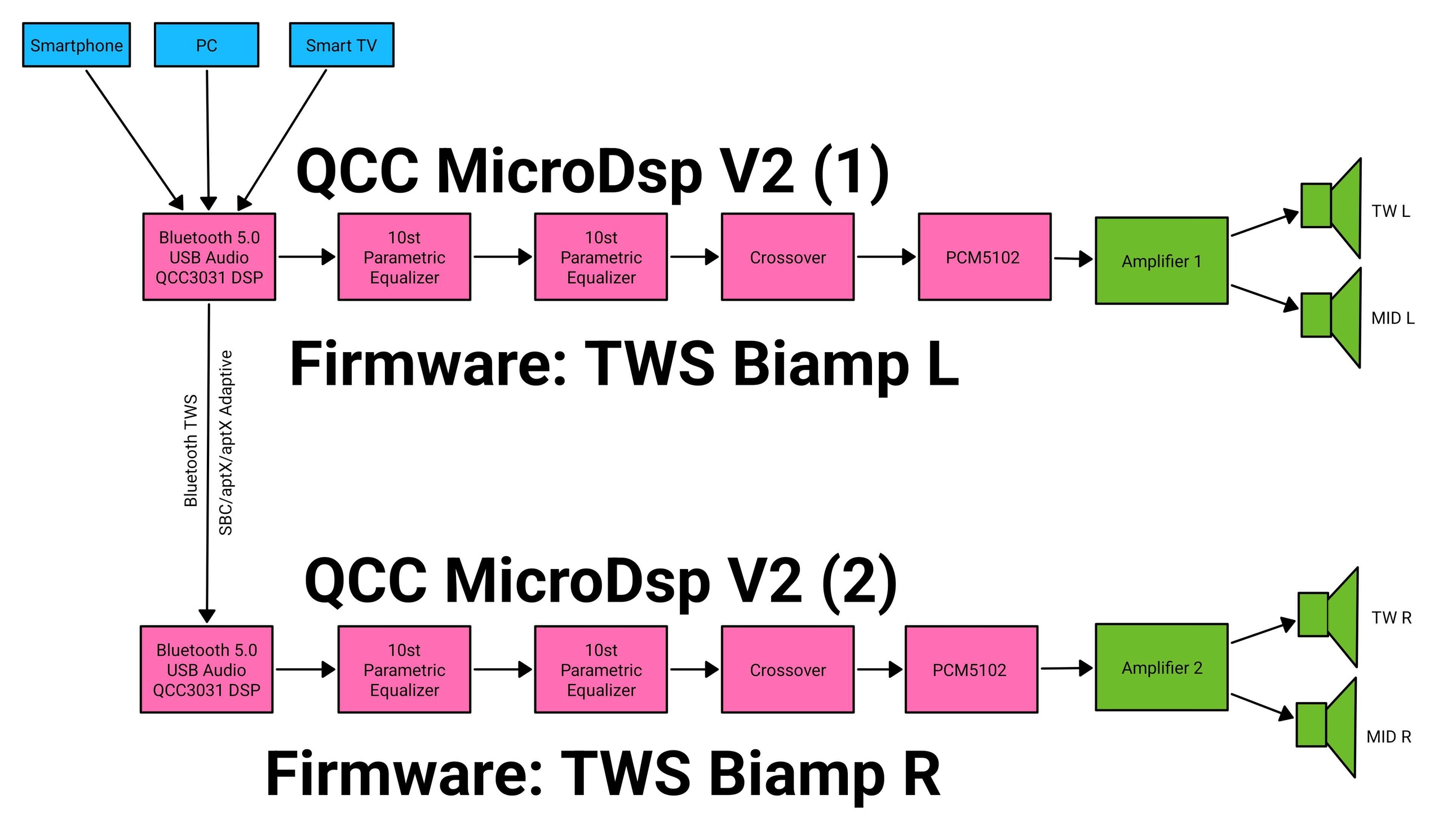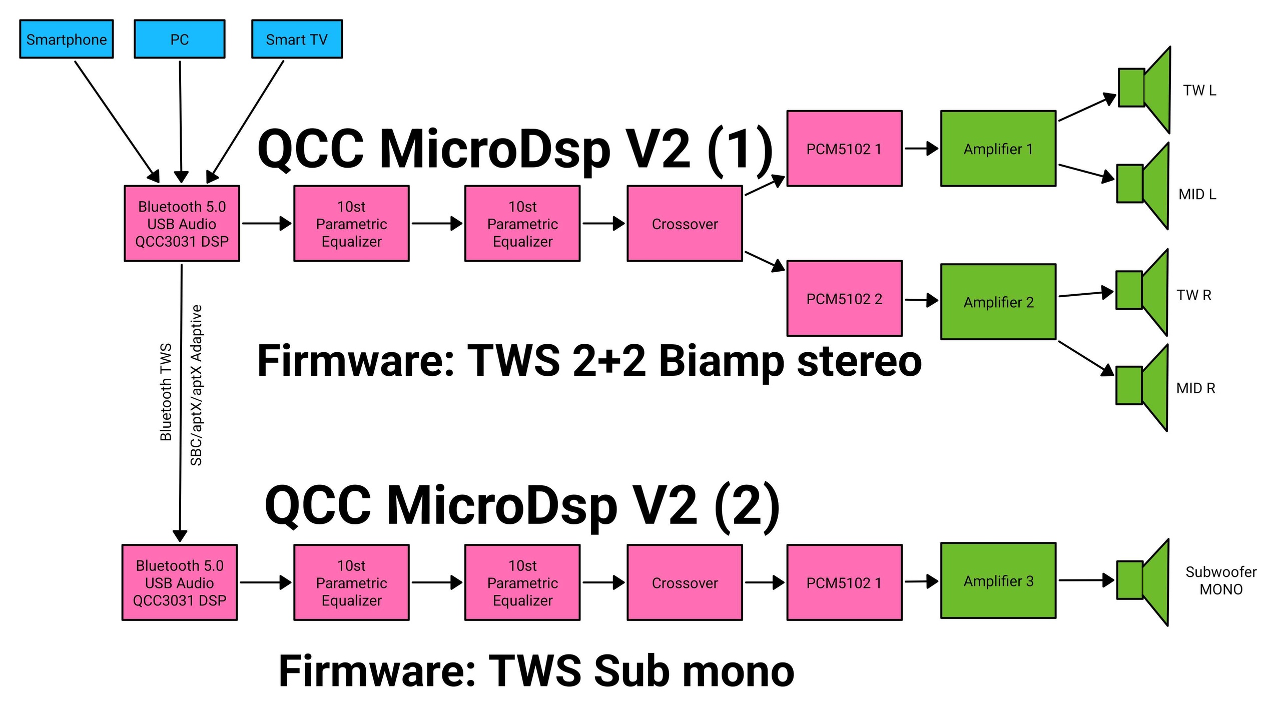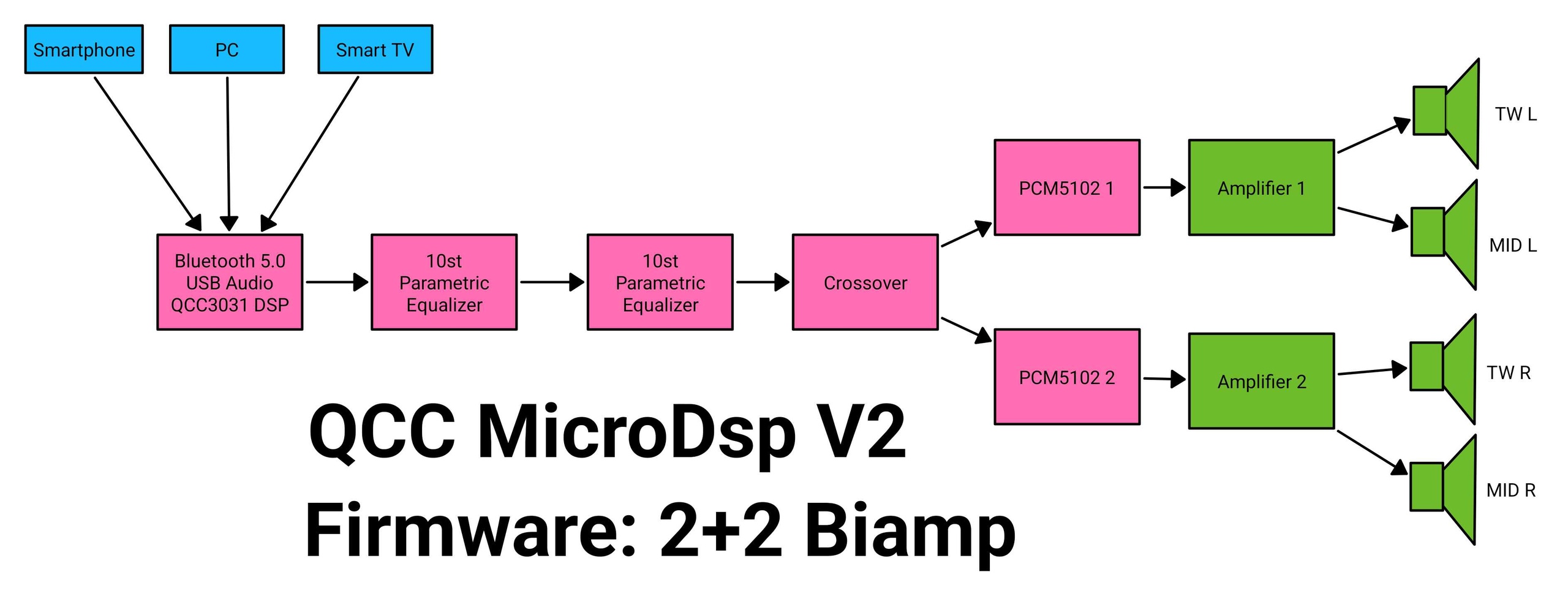 QCCMicroDSP v2 — это доступный и компактный аудио процессор для 4 каналов с высоким качеством звука и множеством дополнительных функций. Устройство построено на чипе QCC3031 от Qualcomm и двух внешних ЦАП PCM5102. Возможность Bi-Amping была изначально заложена в чипы компанией CSR (которую в 2018 году приобрела Qualcomm), однако в открытых источниках мне не встречались примеры реализации подобных проектов на этой платформе.