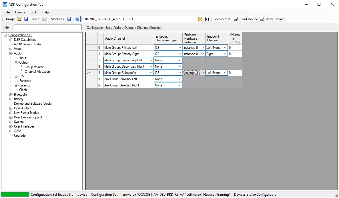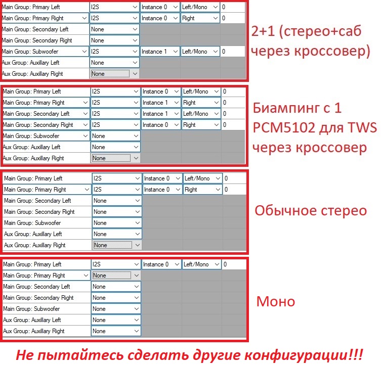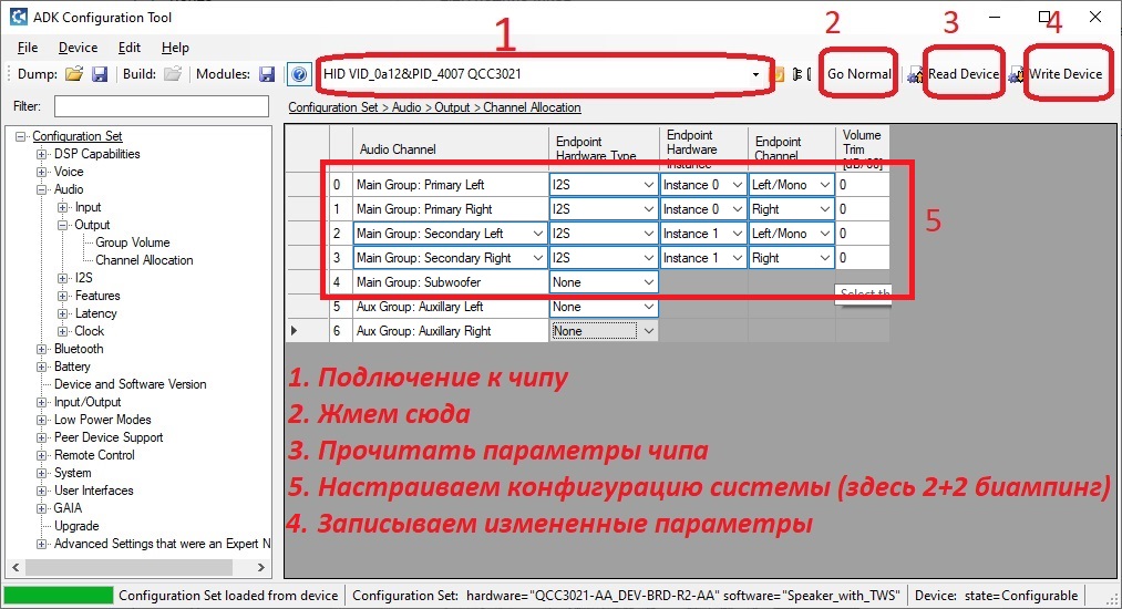 Параметры конфигурации чипа задаются через ADK, например если нужно разделить 4 канала для биампинга, аудиовыходы подключаем так: